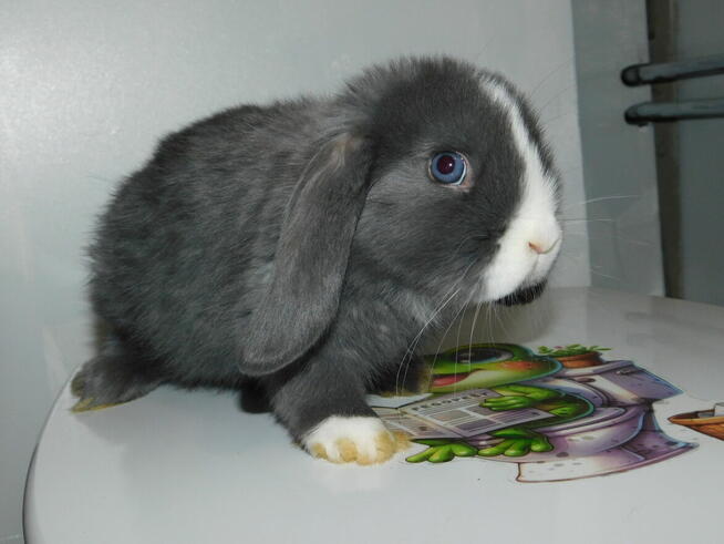 Sprzedam królika mini lop niebiesko- białego samczyka urodzony 19 maja kupki sprawdzone są czyste jego waga półtora kilo.